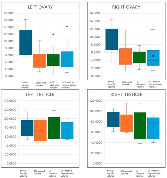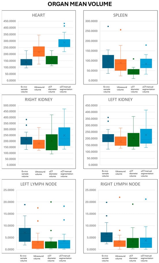 Graphic charts of the mean value for the different organs and volumes. For each organ, from left to right, ex vivo sample volume, ultrasound volume, microCT diameter volume, and microCT manual volume. The box represents the interquartile range, upper and lower lines are maximum and minimum values, isolated points represent outliers, and crosses indicate mean values and inside-the box line median values.
