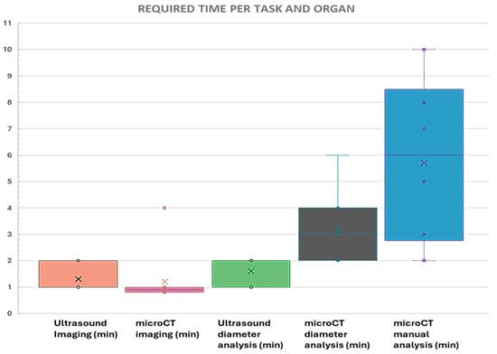 Representation of the time required for each task and organ, including image acquisition and analysis. Note that, in terms of image acquisition, for microCT imaging, some of the organs were scanned simultaneously. The outlier in microCT imaging was the heart, which required 4 min to image. The remaining times required to obtain microCT images of each organ were calculated dividing the total acquisition time by the number of organs scanned.
