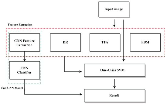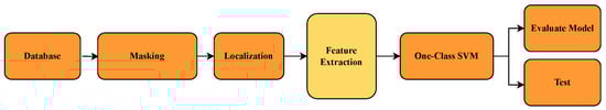 After applying localization and masking techniques, the resulting image is used as input for various methods aimed at parameter extraction. The extracted features are then used as input for the unsupervised OCSVM classifier. Figure 4 summarizes this workflow, from the image processing stage to feature extraction and classification. It is important to note that, in the case of CNNs, the same model is used both for feature extraction and as a classifier.