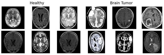 Example images from the two classes in the dataset: Brain Tumor and Healthy.