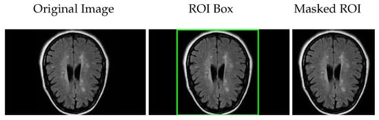 Figure 3 illustrates these steps: the original brain scan, the ROI highlighted by a bounding box, and the final masked ROI extracted for further analysis.
