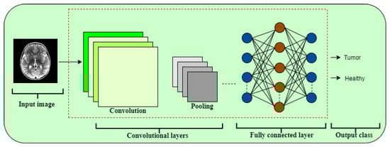 Deep learning, particularly CNNs, has demonstrated remarkable performance in medical image analysis, especially in brain tumor classification. Specialized architectures such as MobileNet, three-dimensional CNNs (3D-CNNs), Parallel Deep CNNs, and Recurrent CNNs have been developed to tackle challenges like tumor morphological variability and computational constraints [,,,,]. These deep learning models consistently outperform traditional methods in terms of accuracy, sensitivity, and specificity. However, a major limitation of deep learning approaches is their computational complexity, often involving millions of parameters, which increases the inference time and demands substantial processing resources. Furthermore, they require large, well-annotated, multi-class datasets that are often scarce in clinical settings [,].