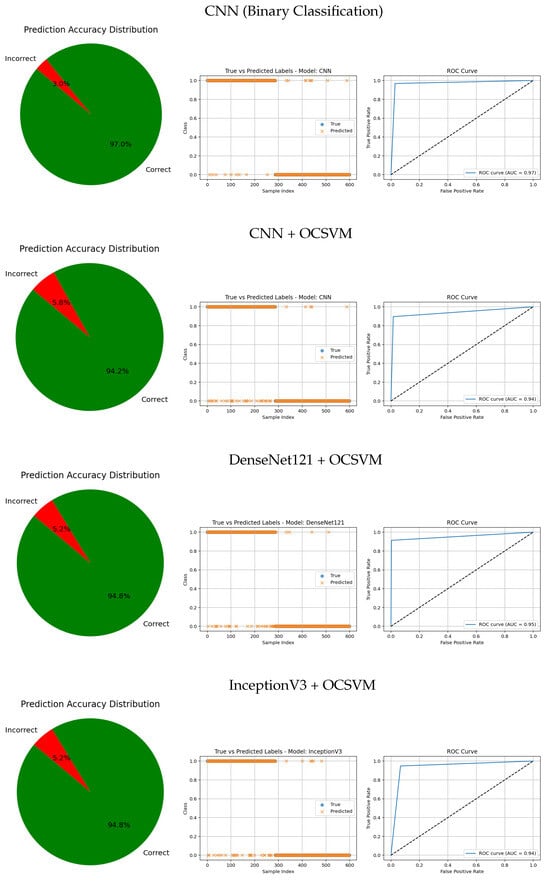 Comparative results of various CNN architectures and CNN-based anomaly detection approaches. Each row shows the prediction accuracy distribution, predicted labels, and ROC curve.