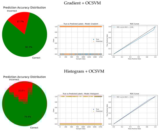 Comparative results of traditional feature-based methods combined with anomaly detection approaches. Each row shows the prediction accuracy distribution, predicted labels, and ROC curve.
