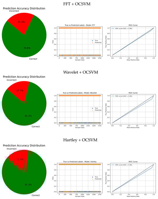 In contrast, traditional feature-based methods like PCA (AUC = 0.42), Gradient (AUC = 0.46), Histogram (AUC = 0.52), FFT (AUC = 0.48), Hartley (AUC = 0.46), and Wavelet (AUC = 0.46) demonstrate poor ROC performance, which is further corroborated by low similarity in the true vs predicted plots and wider error angles in the accuracy distributions. These observations indicate limited anomaly detection ability and less reliable classification.