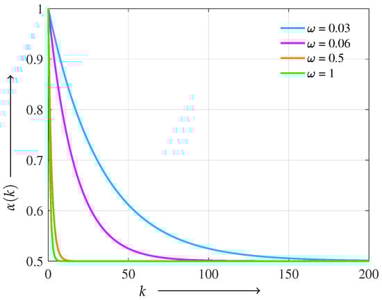 Dynamic scheduling of for different values (). The vertical axis shows , and the horizontal axis shows the number of iterations k.