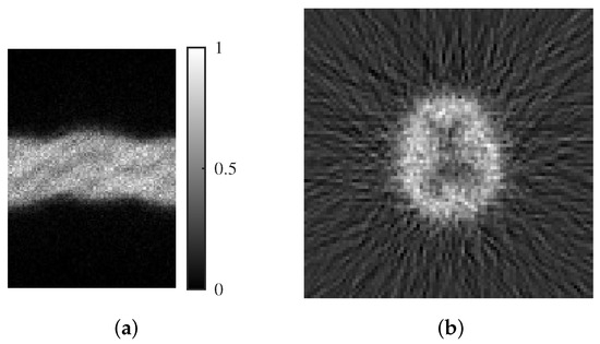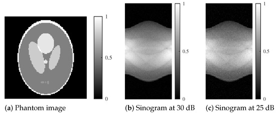 The modified Shepp–Logan phantom used in our numerical experiments is shown in Figure 2a. The phantom consists of 128 × 128 pixels with intensity values ranging from 0 to 1. Projection data p were simulated over 180 degrees using 90 uniformly spaced projection angles. Poisson noise was added to the projections to achieve signal-to-noise ratios (SNRs) of 30 dB and 25 dB.
