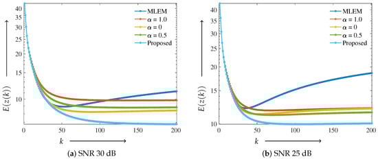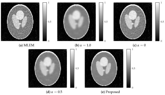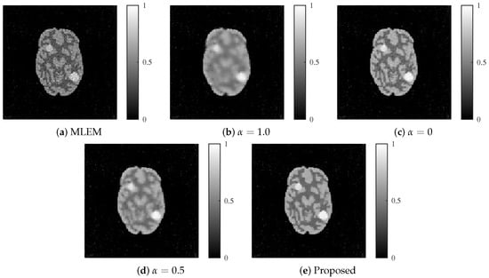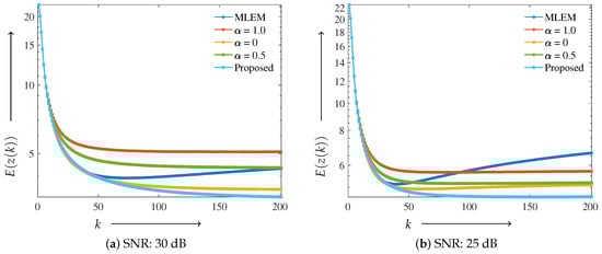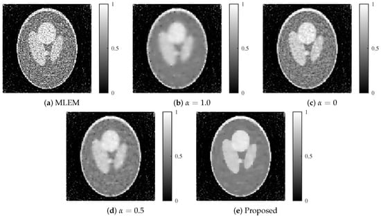 The value of the evaluation function consistently decreased for all methods in the early stages with a small number of iterations k. However, in both the 30 and 25 dB cases, the MLEM method exhibited an increase in as the number of iterations increased due to noise, failing to achieve stable convergence. The ElasticNet-regularized MLEM with a fixed showed better performance near the final iteration () in high-noise conditions (25 dB) compared with L1 () and L2 () regularization. Nonetheless, the proposed method outperformed all other approaches across all noise levels and iteration counts, demonstrating superior stability and convergence behavior.
