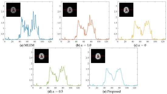 Density profiles of (a) MLEM, (b) , (c) , (d) , and (e) the proposed method for reconstructed images along the horizontal line. The position of the acquired density profile is represented by a red line in the density profile plot.