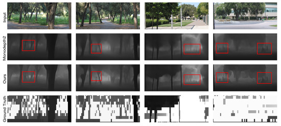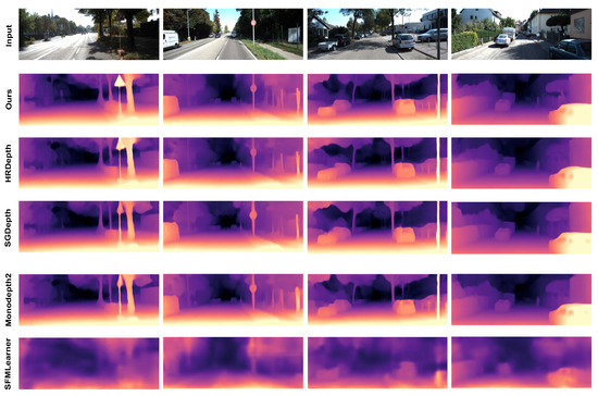 For semantic supervision, we use pseudo-labels generated by a DeepLabv3+ model with a ResNet-101 backbone, pre-trained on the Cityscapes dataset. Although this model is not fine-tuned on KITTI or Make3D, it produces reasonably accurate segmentation results in urban scenes. Some domain mismatches may still occur, particularly in non-driving environments like those in Make3D, leading to noisy semantic labels in certain regions. The evaluation metrics in this paper are consistent with previous works [4,6]. For mean absolute relative error (AbsRel), square relative error (SqRel), root mean square error (RMSE), and root mean square logarithmic error (RMSE_log), lower is better. For the accuracy under threshold (), higher is better. All depth images are calculated within 80 m during validation. Because the self-supervised models trained on monocular video sequences cannot recover the true depth, we use the same scale factor as Monodepth2 [6] to determine the true scale information on depth values.