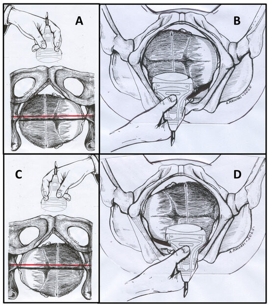 This figure illustrates how to perform a correct ultrasound (US) evaluation of the transverse fetal head during the second stage of labor. (A) Transabdominal transverse scan of Right Occiput Transverse (ROT) position; (B) translabial transverse scan of ROT position; (C) transabdominal transverse scan of Left Occiput Transverse (LOT) position; (D) translabial transverse scan of LOT position. Red lines indicate measurement reference points for geometric parameter assessment.