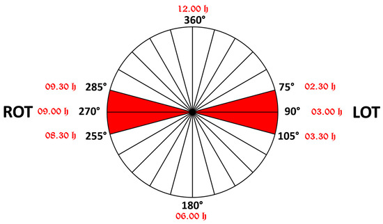 Schematic representation of the transverse position of the fetal head in the maternal pelvis. When the angle of rotation is between 75° and 105°, the position is called LOT (if the fetal occiput is on the maternal left side); when the angle of rotation is between 255° and 285°, the position is called ROT (if the occiput is on the maternal right side). Next to the degree measurements written in black are red notations of the positions according to the “clock face”.