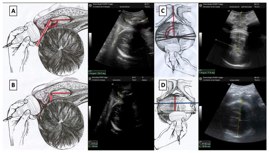 (A) Angle of progression (AoP): the drawing on the right and the US photo on the left show the AoP with the fetal head in Right Occiput Transverse (ROT) position; (B) fetal head–symphysis distance (HSD): the drawing on the right and the US photo on the left show the HSD (red line) with the fetal head in ROT position; (C) midline angle (MLA): the drawing on the right and the US photo on the left shows the MLA with the fetal head in ROT position; (D) asynclitism degree (AD): the drawing on the right and the US photo on the left show the AD with the fetal head in ROT position.