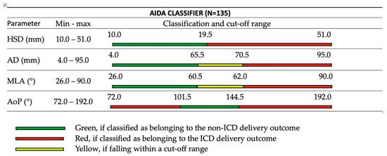 AIDA classifier (N = 135) showing the four geometric parameters (HSD, AD, MLA, AoP) with their measurement ranges and color-coded classification system for predicting delivery outcomes. Green zones indicate favorable conditions for vaginal delivery, yellow zones represent borderline measurements, and red zones suggest high risk for cesarean delivery. Values and classification thresholds as described in Malvasi, Malgieri et al. [33].