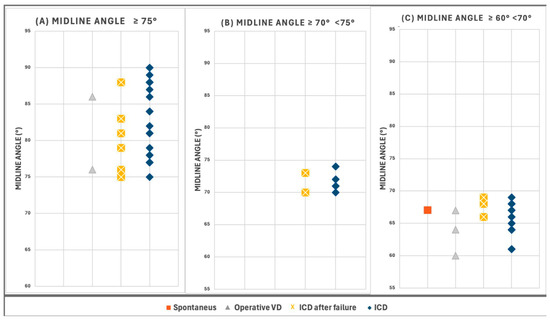 Distribution of cases according to Midline Angle (MLA) values. (A) “Classic Transverse Positions” with MLA values ≥75° (n = 29, 43.9% of study subset). (B) “Near-Transverse Positions” with MLA values between 70° and 74° (n = 9, 13.6%). (C) “Transitional Positions” with MLA values between 60° and 69° (n = 28, 42.4%).