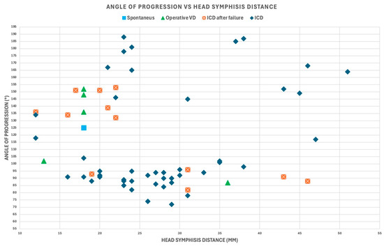 The outcomes of delivery were as follows: 48 intrapartum cesarean deliveries (ICDs), 12 intrapartum cesarean deliveries after failure (ICDs after failure), five operative vaginal deliveries (OVDs), and one spontaneous delivery. Figure 6 and Figure 7 illustrate the Asynclitism degree and Midline angle values, as well as the Angle of Progression and Fetal head–symphysis distance measurements of the examined cases.