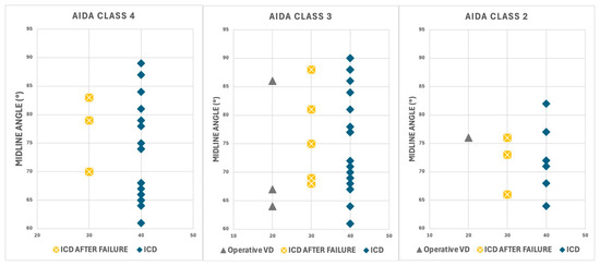 Distribution of delivery outcomes across AIDA Classes 2, 3, and 4 and MLA values. Each panel displays delivery outcomes categorized as immediate intrapartum cesarean delivery (ICD, blue diamonds), cesarean delivery after failed intervention (ICD AFTER FAILURE, yellow crosses), and operative vaginal delivery (Operative VD, gray triangles).