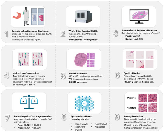 Gonçalves, et al. [9] reported high performance with these models. They used a curated public dataset (DeepHP (H&E slides captured by a microscope at a magnification of 20×)) consisting of 13,921 images derived from 19 histopathological WSIs, including 14 gastric mucosae without morphological changes (9926 negative HP samples images) and five with HP infection (3995 positive sample images). Their best results were obtained using VGG16 (AUC 0.998) as well as InceptionV3 and ResNet50 (AUC 0.994). The first studies developed by Klein, et al. [10] trained a VGG-style neural network on Giemsa- and H&E-stained slides. Their model achieved perfect sensitivity (1.0) but relatively low specificity (0.66) in classifying Giemsa-stained samples. Liscia DS, et al. [11] similarly used a VGG-based model on silver-stained samples, obtaining higher specificity (0.87) and sensitivity (0.89), but a precision of only 77%, due to the localized distribution of HP colonies and the large size of WSIs. In addition, Martin, et al. [12] also achieved strong performance using HALO-AI (fully convolutional VGG network) across two phases (phase 1: 70 HP biopsies and phase 2: 28 HP biopsies). They found a 0.96 sensitivity, 1.0 specificity, 0.99 accuracy, and 0.98 F1 score.