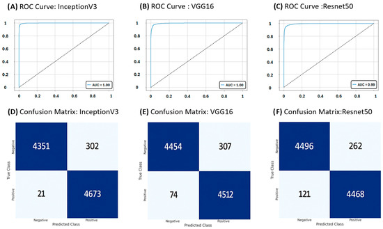 The ROC curves and confusion matrices. ROC of (A) InceptionV3, (B) VGG16, (C) Resnet50. Confusion matrices of (D) InceptionV3. (E) VGG16, (F) Resnet50.