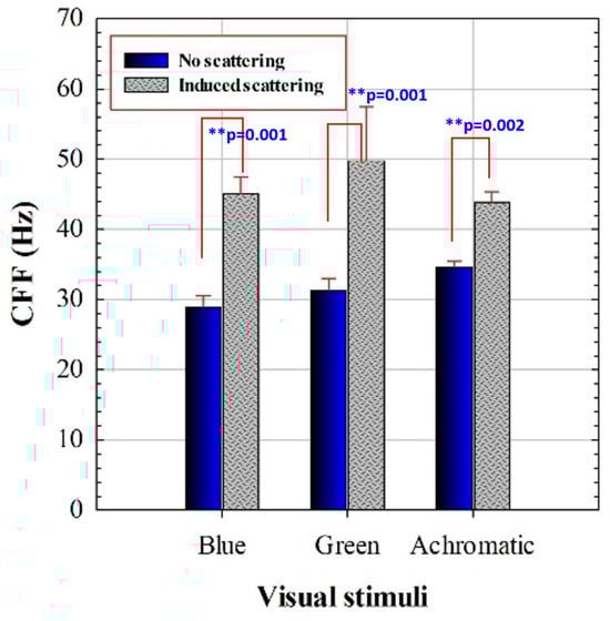 CFF for blue, green, and achromatic visual stimuli for regular and scatter-induced CFF assessment. Asterisks indicate statistical differences (significance level: ** p < 0.005). Error bars correspond to standard deviation of the mean CCF values.