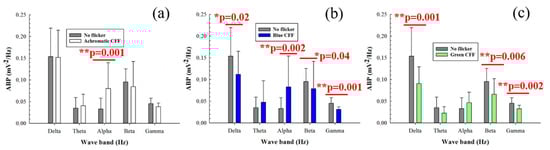 Figure 4 shows the average band power (ABP) calculated from the power spectrum density of the 8 electrodes as a function of the filtered band frequency for all participants. Specifically, it compares the control ABP values (gray bars) corresponding to a steady punctual visual stimulus with the ABP values for flicker stimuli at the critical flicker fusion frequency (CFF) for achromatic (Figure 4a), blue (Figure 4b), and green (Figure 4c) channels of the visual stimulator. Statistical analysis (one-way ANOVA test) revealed increased cortical alpha activity for the achromatic (Figure 4a) and blue flicker stimuli (Figure 4b). In contrast, flicker stimulation induced a reduction in neural activity for high-frequency bands (i.e., beta and gamma oscillations) for both blue and green flicker stimuli (Figure 4b,c, respectively). Furthermore, reduced delta activity was observed only for blue flicker light (Figure 4b). Regarding the influence of the stimulus on the ABP, the statistical analysis shown in Table 4 revealed that for all frequency bands with the exception of the beta range, the change between an achromatic stimulus and another achromatic (green) stimulus generates significant responses in the ABP.