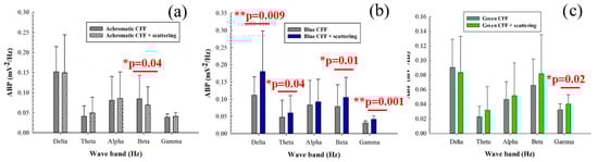 Average band power (ABP) as a function of the waveband for achromatic (a), blue (b), and green (c) CFF stimuli with scattering compared to scattering-free CFF stimuli. Asterisks mark pairs for which a significant difference (p < 0.05) was found.