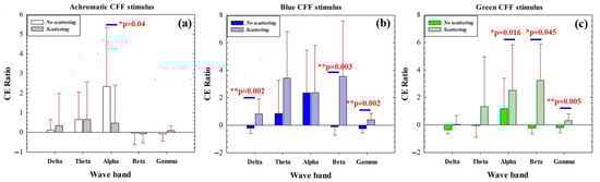 For achromatic stimulation, maximal cortical excitation was observed for the alpha band while using scattering-free CFF stimulus; when scattering is introduced, CE is significantly reduced (Figure 6a). Chromatic stimulation showed an increase in CE as a consequence of optical scattering effects. The scattering-free flicker showed inhibition of the CE ratio for high-frequency bands (beta and gamma) for both blue (b) and green (c) stimuli. In contrast, the introduction of scattering revealed significant excitation of high-frequency neural oscillations (Figure 6b,c). This effect was also observed for the low-frequency delta band for the blue CFF stimulus only.