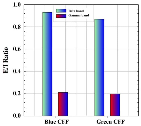 The scattering condition also induces excitability in the gamma range (Figure 11d), but, in a homologous manner to the previous case (stimulation with scatter-free green CFF), the frequency peak of the excited gamma oscillation with optical scattering is shifted in the opposite direction (−2.0 Hz) to the previous state of visual excitation (i.e., scattering-free green CFF). However, unlike in the beta range, the statistical tests (see Table 7) showed correlation between the EEGs shown in Figure 11b in similarity, but with differences in amplitude.