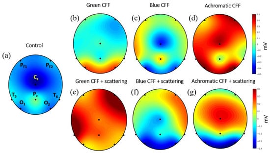 This work defines the cortical excitability ratio (CER) as the ratio of the computed ABP for the given visual stimuli to the previous visual condition (i.e., the control visual stimulus and the scattering free flicker chromatic/achromatic stimulation, respectively). Thus, for scattering-free stimulation (Equation (1)) CER is expressed as the ratio of the ABP for the chromatic/achromatic stimuli to the control value of the ABP for each wave band (f).