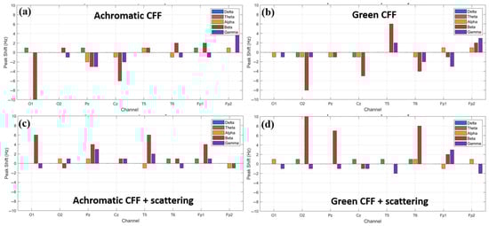 EEG topographic maps further showed that optical scattering not only modifies spectral properties but also alters the spatial distribution of cortical activity, with notable engagement of occipital, prefrontal, and temporal regions under blue and green scattering-induced conditions. This suggests a broader network recruitment that could reflect compensatory responses or cross-modal plasticity, in line with models of cortical reorganization when one pathway is suppressed []. Our results are in line with the findings of Herrmann [], who reported an increase in EEG response and glutamatergic receptor expression under high-frequency visual stimulation. Similarly, our peak-shift analysis revealed that beta inhibition is associated with negative frequency shifts (Figure 10), whereas beta excitation showed positive shifts (Figure 11), reinforcing the validity of peak frequency as an indicator of cortical excitability. In contrast, gamma oscillations demonstrate inverted behavior, showing amplitude changes but peak shifts in the opposite direction.