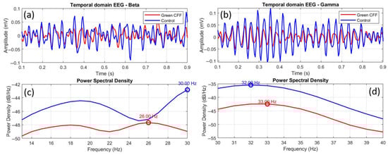 Comparative temporal and frequency domain EEGs between the control and green CFF visual conditions for beta (a,c) and gamma (b,d) wavebands. The overlapping circles on the power spectral density curves correspond to the dominant frequency peak, in each case.
