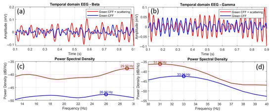 Finally, Figure 11 shows the comparison of EEGs for the scattering-induced condition with respect to the scattering-free green CFF stimulation for beta (a, c) and gamma (b, d) waves. In this case, the time-domain EEGs show higher amplitude in both beta (a) and gamma (b) oscillations. Moreover, the power spectral density distributions showed more intense excitation for beta (c) than for gamma (d) bands. In the case of beta range, a positive peak shift of +3.0 Hz was found. Again, increased excitability is associated with a positive peak frequency shift. Furthermore, the Pearson cross-correlation coefficient, the K-S test, and the RMSE value showed that the EEG signals compared in Figure 10a differ statistically in morphological similarity and amplitude.