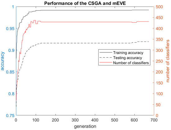 The performance evaluation of the “Classifier Selection Genetic Algorithm” coupled with the mEVE is presented in Figure 2. The “Classifier Selection Genetic Algorithm” starts from the ensemble model with training and testing accuracy and 67 ELM classifiers. Then, the “Classifier Selection Genetic Algorithm” iteratively increases the quality of the initial set of ELM classifiers and helps build a better ensemble model for each generation. The “Classifier Selection Genetic Algorithm” found the best ensemble model in generation 606 and stopped in generation 673.