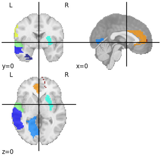 - Tzourio-Mazoyer, N.; Landeau, B.; Papathanassiou, D.; Crivello, F.; Etard, O.; Delcroix, N.; Mazoyer, B.; Joliot, M. Automated anatomical labeling of activations in SPM using a macroscopic anatomical parcellation of the MNI MRI single-subject brain. Neuroimage 2002, 15, 273–289. [Google Scholar] [CrossRef] [PubMed]