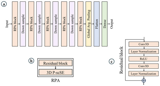 Residual block. As mentioned above, each RPA block consists of a residual block and a P-scSE3D. The residual block allows the network to learn from both the original input and the processed output, addressing the vanishing gradient problem that can occur in deep neural networks [44,45]. As depicted in Figure 1c, the input initially undergoes a convolution layer. However, instead of 3D convolution, we utilize (2 + 1)D convolution, which processes the spatial and temporal dimensions separately. This approach offers an advantage by reducing the number of parameters through the factorization of convolutions into spatial and temporal dimensions [15,43]. Subsequently, layer normalization is applied to normalize the outputs of the previous layer, which can improve training stability [44]. This activation function introduces non-linearity into the network by setting all negative outputs to zero and keeping the positive outputs unchanged. A ReLU [46] activation function is then employed to further introduce non-linearity into the network. It essentially sets all negative outputs to zero and keeps the positive outputs unchanged. We then reapply the (2 + 1)D convolution and layer normalization. Finally, the original input is added to the output of the second convolutional branch. This exemplifies the core concept of the residual block—it allows the network to learn the difference between the input and the output from the convolutional layers, potentially enabling it to capture more complex features. By incorporating residual blocks, the network can theoretically learn from both the original input and the refined features extracted through the convolutional layers, potentially improving the model’s performance.