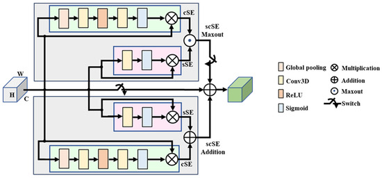 P-scSE3D. Parallel spatial and channel squeeze-and-excitation [47] was initially introduced for foot ulcer segmentation. The P-scSE module is an improvement upon the squeeze-and-excitation module [48,49], which aims to enhance a network’s representational capabilities by emphasizing important features while reducing the emphasis on less relevant ones. The original P-scSE3D was designed for 2-dimensional space. In this work, we extend it to 3-dimensional space. As shown in Figure 2, it consists of three main blocks: cSE, sSE, and scSE; cSE stands for spatial squeeze and channel excitation. As the name implies, it first squeezes spatial dimensions by applying global pooling and then excites channels by performing dimension reduction specified by a reduction ratio, r, that determines the capacity and computational cost of the cSE block. The dimension is increased back and maps to between 0 and 1 using a sigmoid function. These weights are then used to recalibrate the original input by performing an element-wise multiplication between them. The sSE block stands for channel squeeze and spatial excitation. Channels are squeezed by applying a convolution layer. Then, the excitation matrix is generated by applying a sigmoid function. This matrix is used to recalibrate the input the way it did in the cSE block. The cSE and sSE blocks are then combined to create the spatial and channel squeeze-and-excitation (scSE) block. The combination can be made in different ways such as adding them element-wise, taking the maximum between them (max-out), multiplying them, or concatenating them. The P-scSE module tackles the challenge of choosing the proper combination operation in emphasizing informative features. While the multiplication of outputs from two squeeze-and-excitation (SE) blocks seems intuitive, it risks losing crucial data, especially in healthcare where subtle details are essential. This happens because multiplication essentially mutes pixels needing emphasis from both blocks. Concatenation, on the other hand, preserves all information but doubles the number of channels, making the model computationally expensive. The P-scSE offers a clever solution: it uses parallel branches. One branch leverages max-out to ensure important features from either SE block are captured, while the other branch uses addition that gives equal importance to both blocks. The outputs from these branches are then simply added, achieving the benefits of both max-out and addition without further adjustments, as each SE block has already refined the data. A switch (SW) is utilized to configure the shorted P-scSE by bypassing the max-out scSE when there are fewer feature maps available.