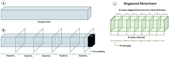 Video segment generation. (a) Original video, (b) video split into segments. Zero-padded frames are added to keep the segment size fixed, and (c) the structure of a segment. A frame gap is used to skip some frames.
