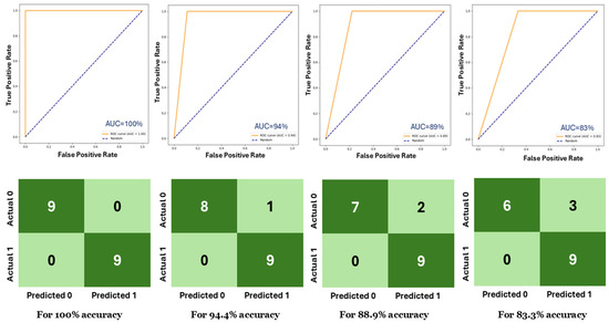 For example, with N = 50 and G = 5 (resulting in a segment size of 250), the model achieved an F1-score of 93.5%. However, the same result could be achieved with a smaller segment size of 150 by using N = 10 and G = 15. This is due to the nature of the videos, where consecutive frames do not contain significant variation, and distant frames offer more distinct feature information. We also tabulated the maximum and minimum evaluation results found in 20 experiments. As shown in Table 2, all four configurations achieved 100% accuracy, F1-score, and AUC. Except for the (N = 100, G = 2) configuration, the other configurations achieved 83.3%, 82.4%, and 83.3% for accuracy, F1-score, and AUC, respectively. The (N = 100, G = 2) configuration showed the minimum performance among them. Table 3 tabulates the number of incorrect predictions for all 20 experiments. For instance, out of 20 experiments, there are 5 where the (N = 10, G = 15) configuration generated no incorrect predictions. In nine experiments, it made only one incorrect prediction. In three experiments, it made two incorrect predictions, and in three experiments, it made three incorrect predictions. It never made more than 3 incorrect predictions among all 20 experiments. Although the (N = 100, G = 2) configuration has seven experiments where it did not make any incorrect predictions, it made four incorrect predictions in four experiments. Considering the results of these three tables, we found the most optimal configuration is (N = 10, G = 15). This configuration will be used in the later discussion. Figure 5 displays the receiver operating characteristic (ROC) curve and confusion matrix for different test accuracies for (N = 10, G = 15), with the area under the curve (AUC) value ranging from 100% to 83%.