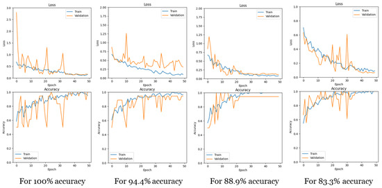 Loss and accuracy curves. Figure 6 illustrates the training and validation curves for loss and accuracy with (N = 10, G = 15), showcasing curves for different test accuracies. It is evident that for all test accuracies, the training proceeded without overfitting, as both the training and validation curves exhibited similar changes simultaneously.