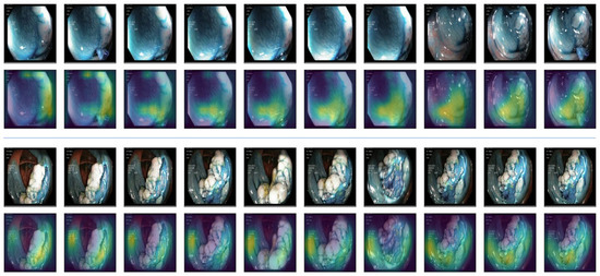 These gradients are then used to weigh the importance of each feature map, and the heatmap is created by taking a weighted sum of the feature maps, followed by a ReLU activation. In Guided Grad-CAM, the gradients are passed backward through the network, but only positive gradients are allowed to propagate. This supposedly refines the Grad-CAM heatmap to focus on image features that directly contribute to the class activation. Figure 7 displays heatmaps for our GI data alongside the original frames for better comparison. In the samples, the yellow region indicates the more focused zone for making predictions. It is observed that the model successfully avoided the black border region and instead focused on the gastrointestinal regions.