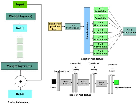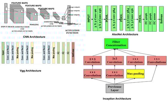 | Inception [78] | This deep learning architecture revolutionised convolutional neural networks by introducing multi-scale processing within a single layer. The first model, Inception V1 (also known as GoogLeNet), uses an “Inception module” that applies multiple convolutions (1 × 1, 3 × 3, and 5 × 5) and pooling operations in parallel within the same layer. |