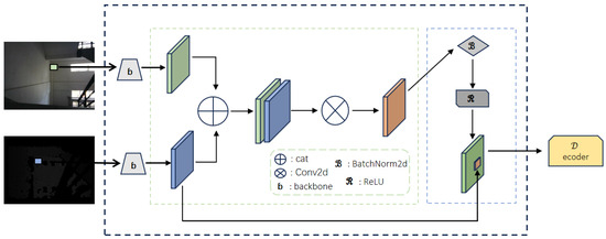 The Skip-Connection Fusion module integrates RGB and depth features extracted from their respective backbones by concatenating them along the channel dimension, creating a unified representation that combines complementary information from both modalities. This combined feature map undergoes a  1 × 1  convolution to refine and compress the fused features, followed by batch normalization to stabilize the feature distribution and improve training efficiency. A ReLU activation function is then applied to introduce non-linearity and enhance feature expressiveness. Finally, the processed fused features are added back to the original RGB features using a skip-connection, preserving low-level RGB details while benefiting from the depth-informed enhancements. This design ensures efficient feature integration, maintaining critical spatial and textural details for downstream decoding tasks.