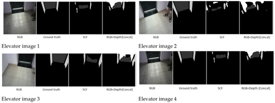 RGB images  X R H × W × 3  encapsulate high-dimensional texture and chromatic information, whereas depth images  X d R H × W × 1  convey geometric and structural spatial cues. By concatenating their feature embeddings, a joint representation is formed that combines texture and appearance-based information from RGB features with geometry-based cues from depth features. This fused representation is particularly effective for delineating intricate classes such as upstairs, downstairs, and distinct elevator components.