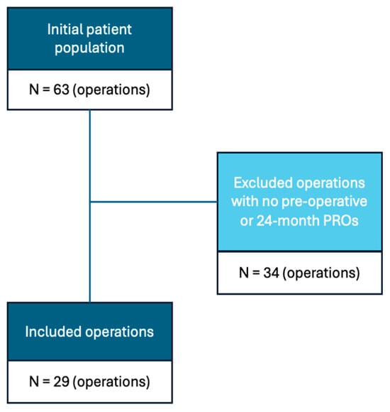 For the present study, an additional exclusion criterion was added for PRO completeness. Any patients who did not have preoperative and 24-month PRO data were excluded. This excluded 34 out of the 63 operations, leaving 29 for analysis (Figure 1).