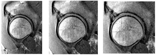 Three individual reviewers, one fellow and two medical students under the supervision of a board-certified musculoskeletal radiologist, were blinded to patients’ surgical information and independently analyzed each patient’s preoperative MRI. Each reviewer performed three separate sequencing analyses with the Syngo.via T2 mapping software (Siemens Healthineers, Erlangen, Germany) on the sagittal cut analysis of each patient’s preoperative MRI. All MRIs were obtained preoperatively within three months of the surgery, except for three patients whose MRIs were completed more than three months prior to surgery (four months, eight months, and eighteen months). The sagittal plane was selected to optimize the visualization of the labrum, articular cartilage, and chondral-labral interface in the anterior lateral/superior quadrant, as these tissues are orthogonal to, and consequently most reliably seen, in short-diameter cross-section on sagittal images. Opting for the sagittal plane provided the best resolution, least partial volume averaging, and least magic angle artifact from the sphericity of the tissues of interest. Each reviewer independently selected two to three sagittal cuts from each patient’s MRI for analysis. The selection criteria for these cuts were as follows: (1) the highest definition of labrum morphology and (2) clear partitions between femoral head cartilage and acetabular cartilage. All reviewers analyzed the same anatomical regions but independently selected the specific cuts that best met these criteria for each patient. Structures that were sequenced included the hip labrum (Figure 2 left), acetabular cartilage divided into three separate zones (anterior, superior, and posterior) (Figure 2 center), and the femoral head cartilage divided into three separate zones (anterior, superior, and posterior) (Figure 2 right). Each zone was manually divided and corresponded to zones 2, 3, and 4 in the acetabular and femoral head zones, as described by Iliziliturri et al. [24]. The average T2 mapping value for the labrum and each respective zone on the acetabulum and femoral head was recorded.