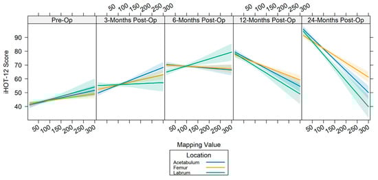 The T2 mapping values for cartilage and labral tissue were positively associated with the baseline iHOT-12 scores (acetabular β = 0.036, p = 0.001; femoral β = 0.024, p = 0.011; and labral β = 0.045, p = 0.006) (Table 2). At the mid-term follow-up, cartilage T2 values were positively associated with the 3-month iHOT-12 scores (acetabular β = 0.064, p < 0.001; femoral β = 0.037, p < 0.001) but not at 6 months (p > 0.05). Conversely, labral T2 values were only significantly associated with iHOT-12 scores at 6 months (labrum β = 0.05, p = 0.002). The T2 mapping values of cartilage and labral tissue were negatively associated with the 12-month (acetabular β = −0.086, p < 0.001; femoral β = −0.063, p < 0.001; labral β = −0.101, p < 0.001) and 24-month (acetabular β = −0.158, p < 0.001; femoral β = −0.104, p < 0.001; labral β = −0.189, p < 0.001) postoperative iHOT-12 scores (Table 2, Figure 3).