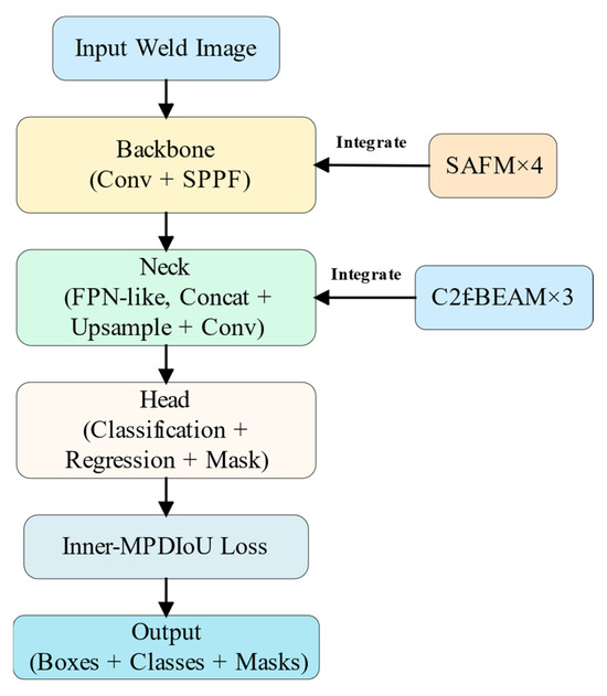 As shown in Figure 3, the SABE-YOLO model is built upon YOLOv8n-seg and consists of three main components: the Backbone, Neck, and Head. Structure-aware and boundary-enhanced mechanisms are integrated into each stage to improve the capability of the model in weld seam instance segmentation tasks.