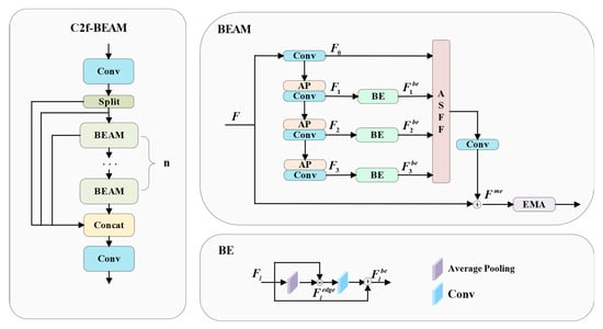 To better integrate multi-scale boundary detail information, the ASFF module is introduced for multi-scale feature aggregation, combined with the EMA mechanism to enhance the representation of critical detail features. Based on this, the BEAM is embedded into the C2f block of the neck network, resulting in the proposed C2f-BEAM with enhanced boundary representation and feature aggregation capabilities. The structure of the C2f-BEAM used in this study is illustrated in Figure 6.