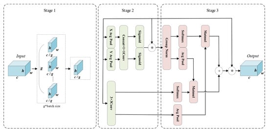 As illustrated in Figure 7, the EMA module consists of three main stages. In the first stage, feature grouping is performed on the weld seam features. For any given input feature map , EMA divides it into G sub-feature groups, each learning semantic representations independently. This grouping strategy enables more efficient allocation of GPU resources and facilitates parallel processing. Moreover, it enhances semantic-aware feature learning while suppressing noise. The grouping process is formulated in Equation (15) [16].