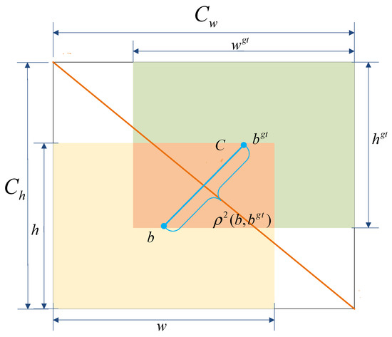 The term denotes the intersection over union between the predicted box and the ground truth box. The symbol ρ represents the Euclidean distance between the centers of the two boxes. The parameters and denote the centers of the predicted and ground truth boxes, respectively, while and are the width and height of the predicted box and and correspond to those of the ground truth box. denotes the diagonal length of the smallest enclosing box that contains both the predicted and ground truth boxes. The coefficient α serves as a balancing factor for the weighted terms, and v evaluates the consistency of the aspect ratios between the predicted and ground truth boxes. The structure is illustrated in Figure 8.